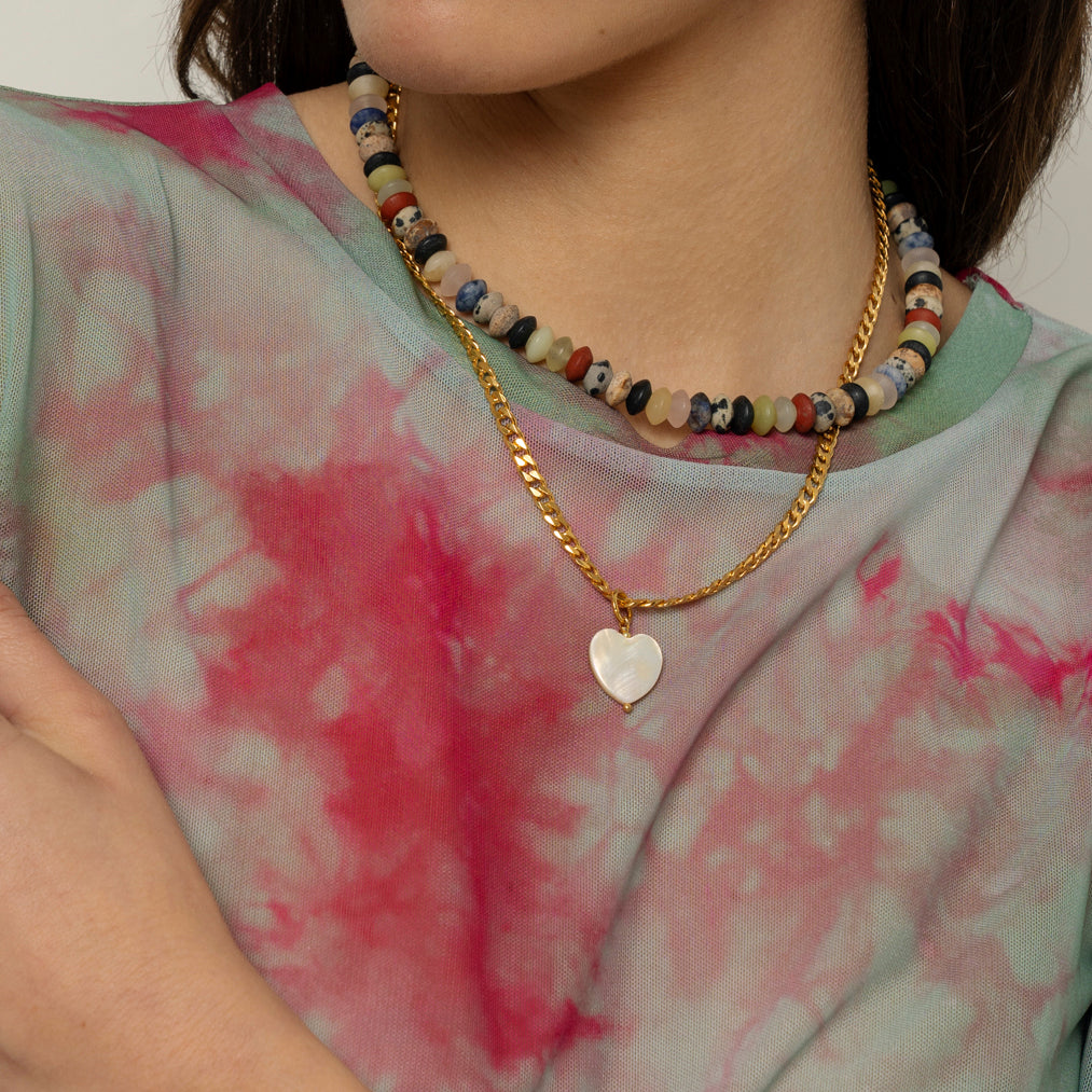 Entdecke unseren Herz-Anhänger aus Perlmutt, der sich perfekt mit den Ketten Julia, Toni und Madita sowie den Creolen Marta und Nola der Mix & Match Collection kombinieren lässt. Mit einer Größe von 15-18 mm ist dieser Anhänger ein zartes und stilvolles Schmuckstück, das deinem Outfit eine romantische Note verleiht.